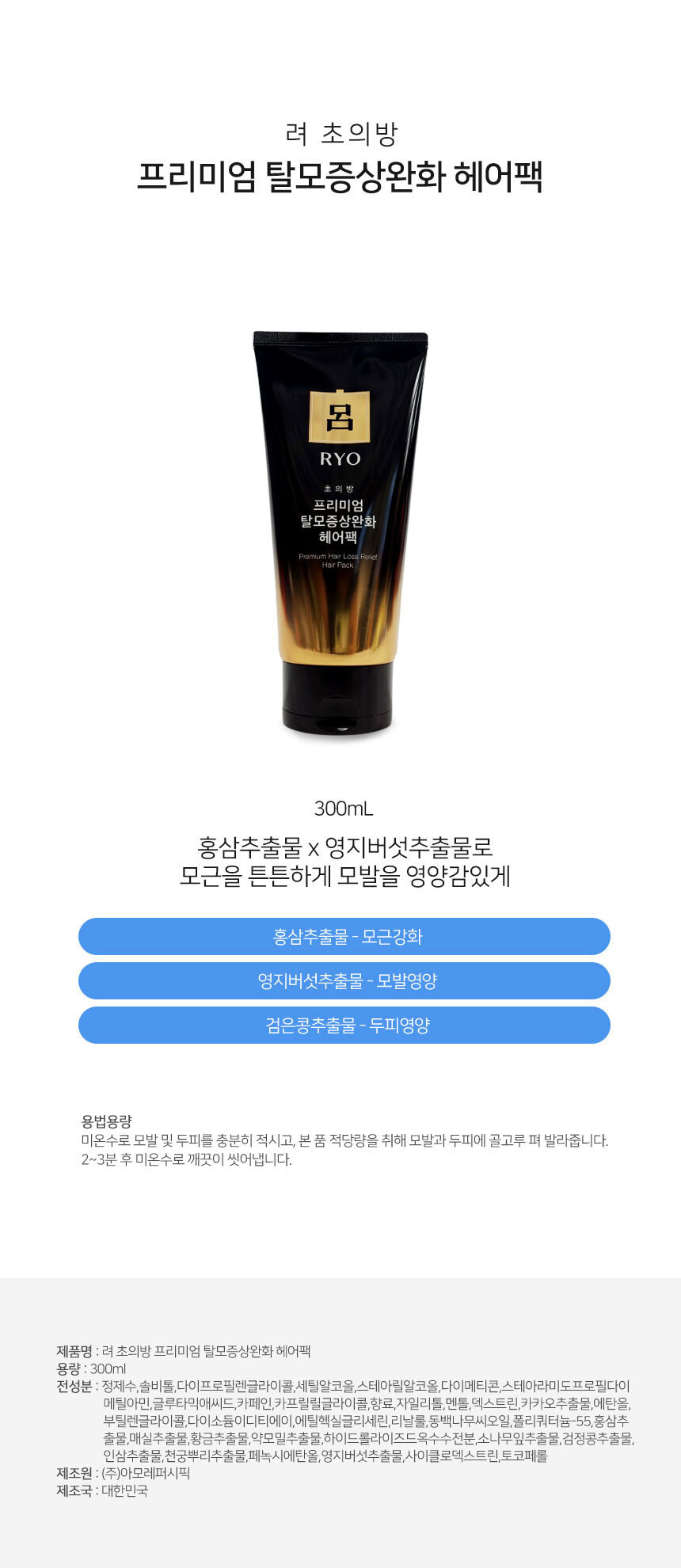 려 초의방 프리미엄 헤어팩 홍삼추출물 영지버섯 영양 요약정보 및 구매